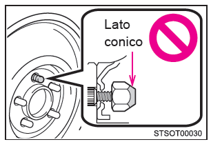 Olio e grasso possono far sì che i dadi ruota siano eccessivamente serrati, causando danni al cerchio ruota o ai bulloni. Inoltre, l'olio o il grasso possono provocare l'allentamento dei dadi ruota e la ruota potrebbe staccarsi causando seri incidenti con il rischio di lesioni gravi, anche letali. Rimuovere ogni traccia di olio o grasso dai bulloni o dai dadi ruota.